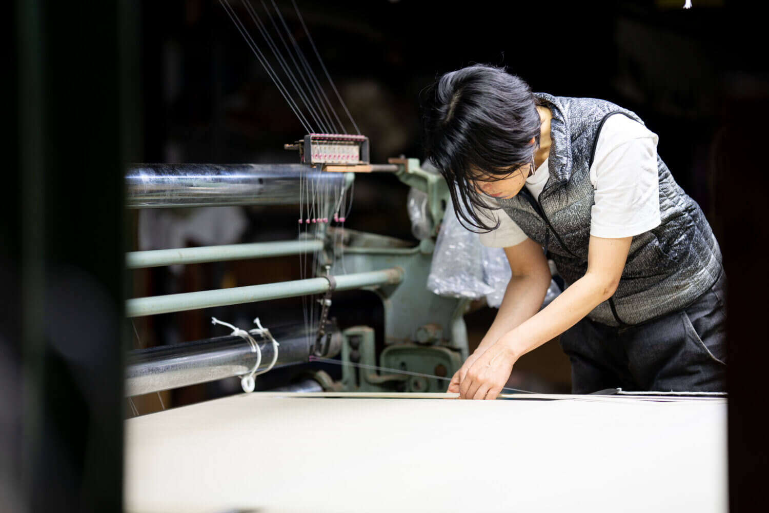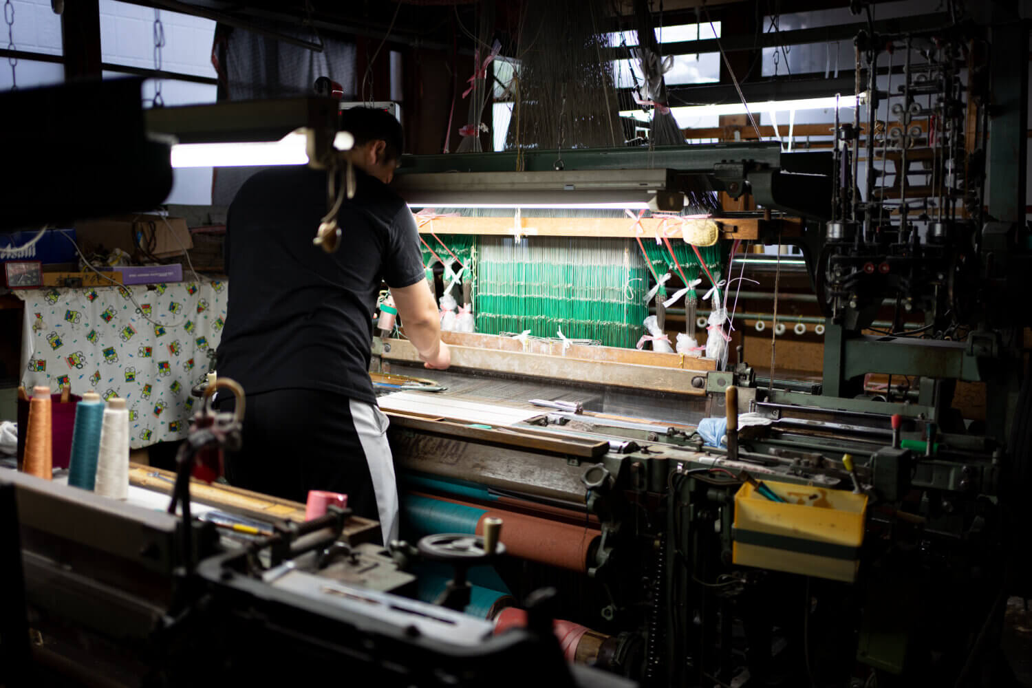 旧街道を走ると、昔ながらの屋敷が立ち並んでいる。漆喰の壁が美しく、玄関には立派な梁がかかっていて、広い土間が続いているところを想像する。そして小さな小屋を見るたびに、ここにも機があったのだろうと思う。農家の副業として、母親の家仕事として。1、2台の織機を拵える家がたくさんあった。「昔は向かいの家も、両隣も、斜向かいも全部機屋だったんだで」。その数は1万軒を超えていたという。現在でも道路脇に木枠に巻かれた絹糸が並べられていたり、ベランダに万国旗のように絹糸が干されていたり、日常風景の中に突然糸が出現する。もの珍しかった風景も、やがて「ああ、いい天気が続くんだなあ」と天気予報の代わりになった。通り雨に濡れてしまわないように、機屋は雨雲レーダーのチェックが欠かせない。