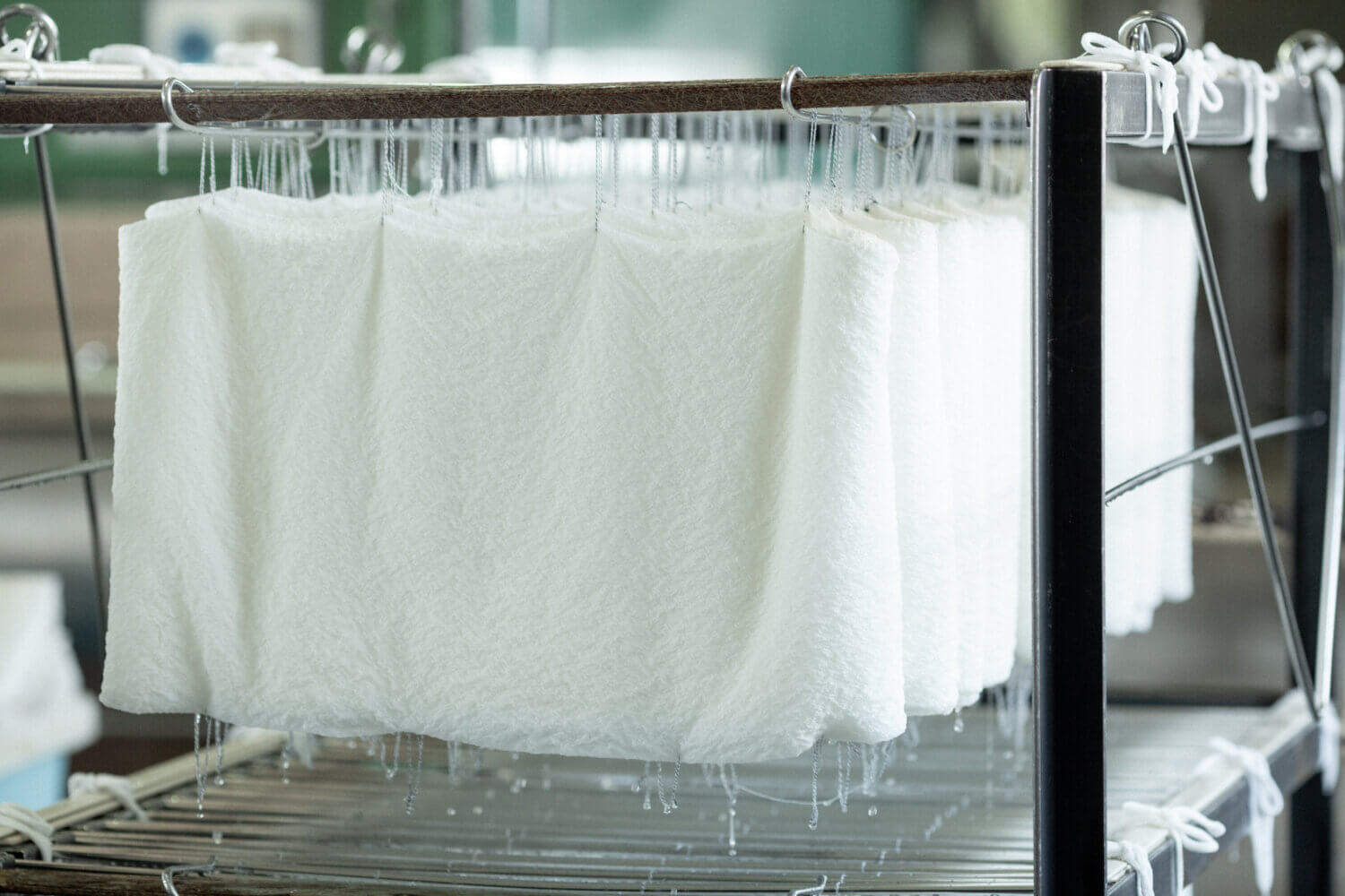 looms. “In the old days, many houses across the street, on both sides, were weaving factories”. The number was said to have exceeded 10,000. Even now as everyday scenery, silk thread wrapped around wooden frames, line the side of the road while loops of silk yarn dry on balconies, like banners. This backdrop, which seemed curious to me at first, eventually became a substitute for the weather forecast, letting me know, “Oh, the good weather will continue”. It is essential for them to check the raincloud radar, so that their thread won’t get wet in a sudden downpour.